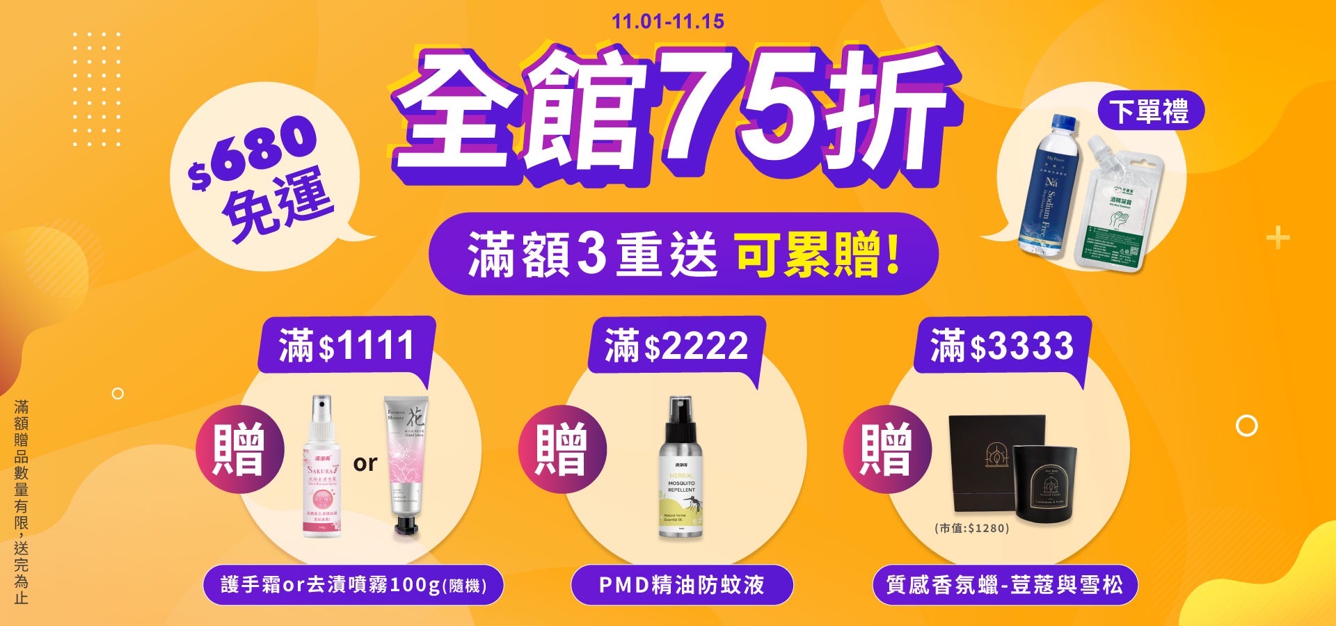 11/01(五)-11/15(五) 全館不限門檻75折!