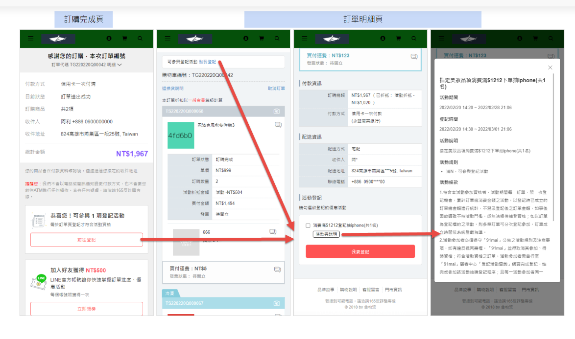 訂購完成將提示消費者前往訂單明細進行登記或消費者可直接進入訂單明細頁登記,登記完成即為成功。